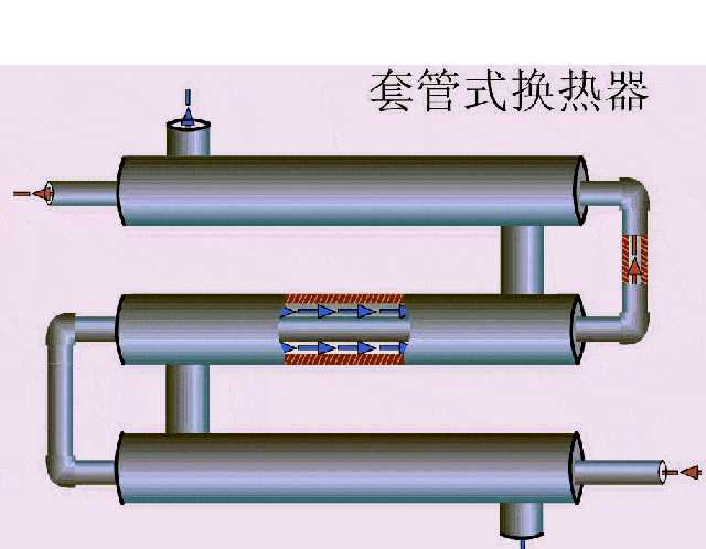 图2喷淋式换热器2.套管式换热器:如图3结构:套管式换热器系用管件将两种尺寸不同的标准管连接成为同心圆的套管,然后用180°的回弯管将多段套管串联而成。每一段套管称为一程,程数可根据传热要求而增减。每程的有效长度为4~6m,若管子太长,管中间会向下弯曲,使环形中的流体分布不均匀。优点为:构造简单;能耐高压;传热面积可根据需要而增减;适当地选择管内、外径,可使流体的流速较大;且双方的流体作严格的逆流,都有利于传热。缺点为:管间接头较多,易发生泄漏;单位长度具有传热面积较小。