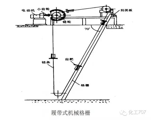 污水的一级处理1.格栅分类:按形状可分为平面格栅、曲面格栅;按栅条的间隙分为粗格栅、中格栅、细格栅。工作原理:由一种独特的耙齿厂装配成一组回转格栅链。在电机减速器的驱动下,耙齿链进行逆水流方向回转运动。耙齿链运转到设备的上部时,由于槽轮和弯轨的导向,使每组耙齿之间产生相对自清运动,绝大部分固体物质靠重力落下,而另一部分则依靠清扫器的反向运动把粘在耙齿上的杂物清扫干净,这样的原理。