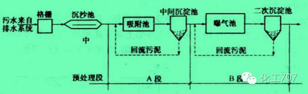 (5)AB法是吸附-生物降解工艺的简称,是由德国亚琛工业大学(Aachen)宾克(Bohnke)教授于20世纪70年代中期开创。该工艺于80 年代初应用于工程实践。目前, 国内已有多家城市污水处理厂采用了AB 法工艺。与传统活性污泥法相比,AB法主要有下列特征:未设初沉池,由吸附池和中间沉淀池组成的A段为一级处理系统;B段由曝气池和二次沉淀池组成;A、B两段各自拥有独立的污泥回流系统,两段完全分开,各自由独特的微生物群体,有利于功能的稳定。AB法工艺: